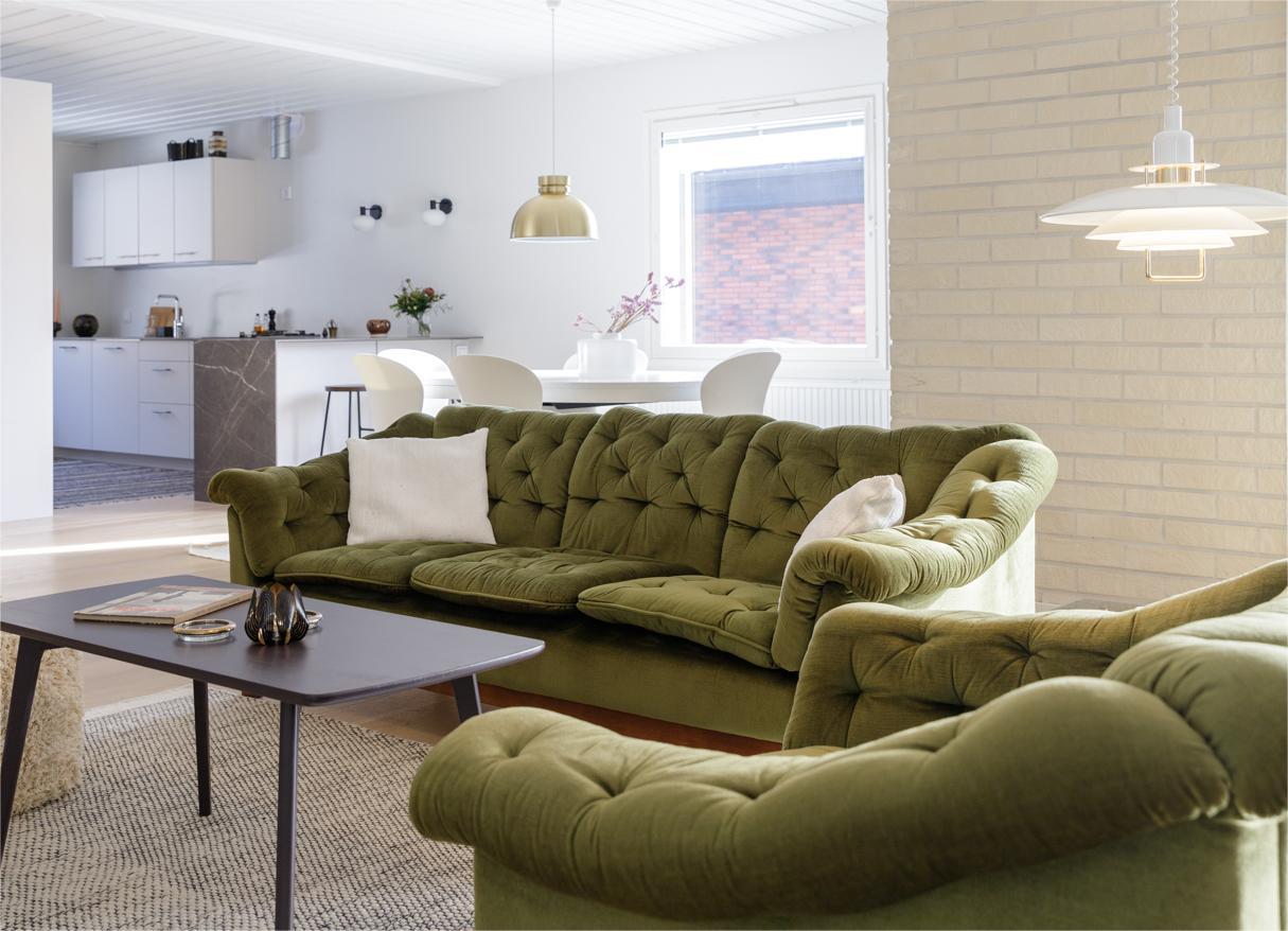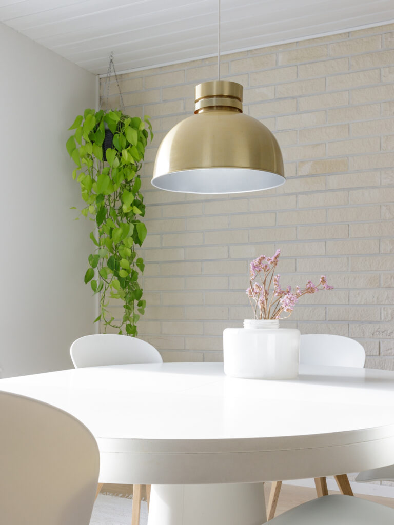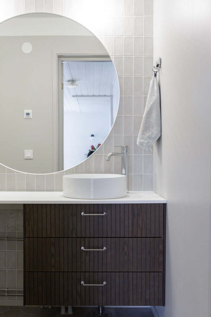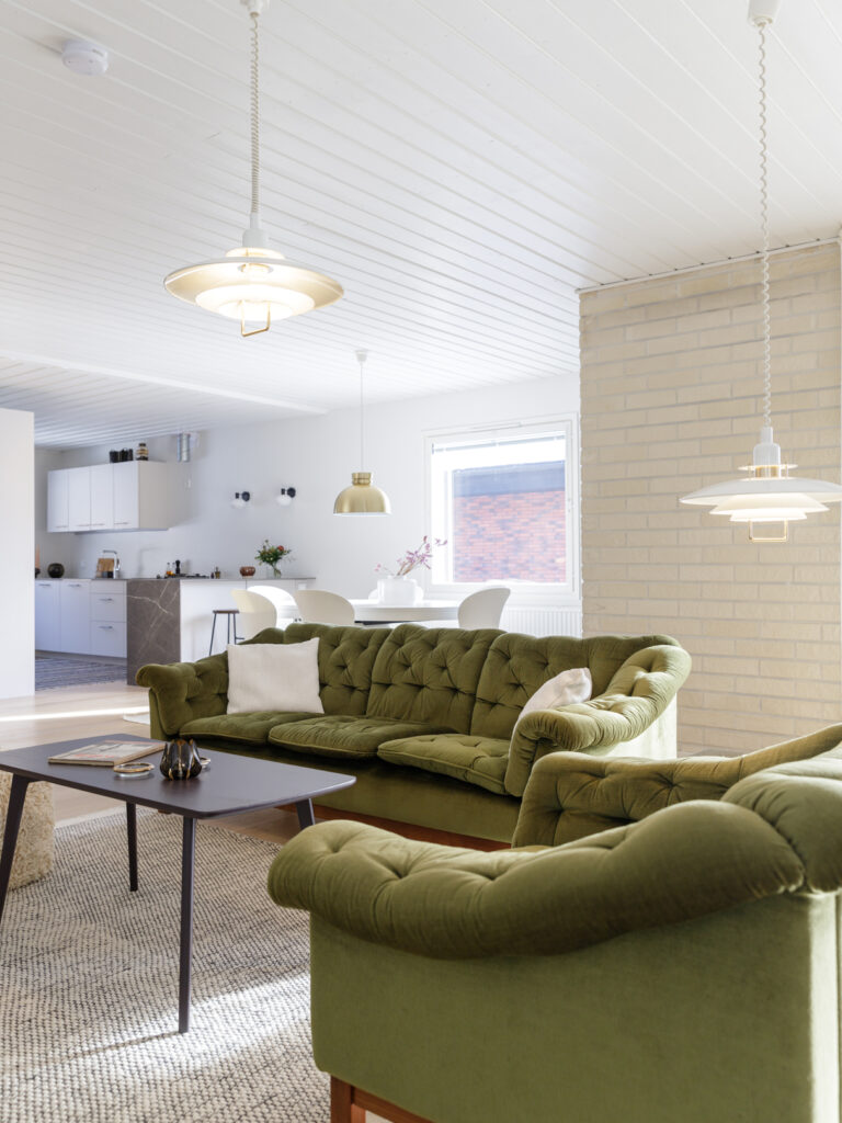 Kohteessa haluttiin kunnioittaa talon 80-luvun henkeä, joten sävy- ja materiaalivalintoja tehtiin tämän ajatuksen pohjalta. Sisustussuunnittelu sisälsi koko talon pintamateriaalivalinnat sekä wc- ja pesutilojen muutossuunnitelmat. Asukkaiden persoonalliset perintökalusteet tekevät tästä kohteesta ihanan kodikkaan ja yllätyksellisen.