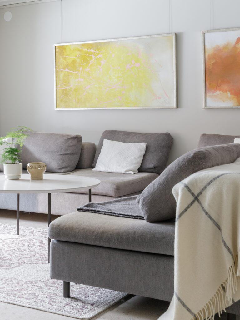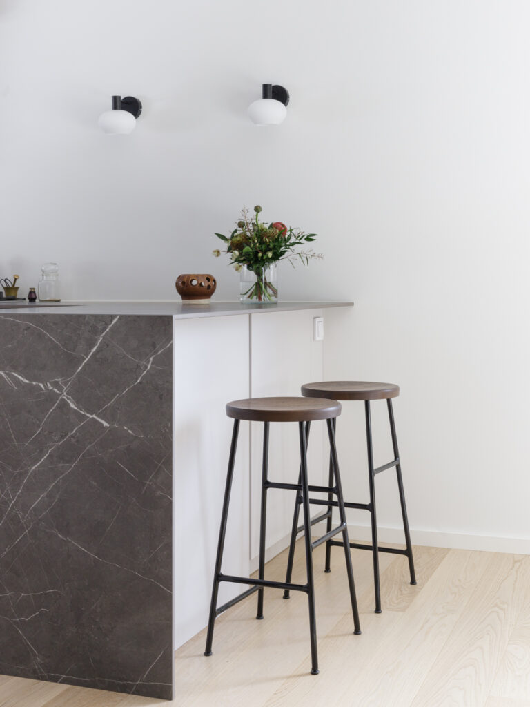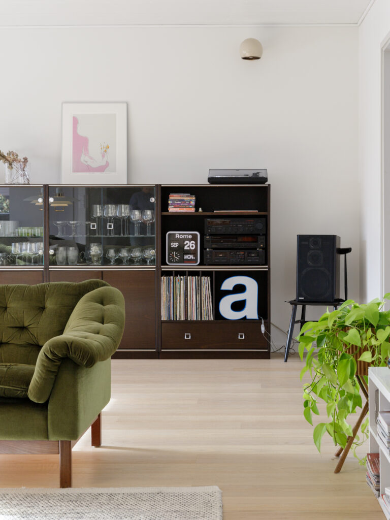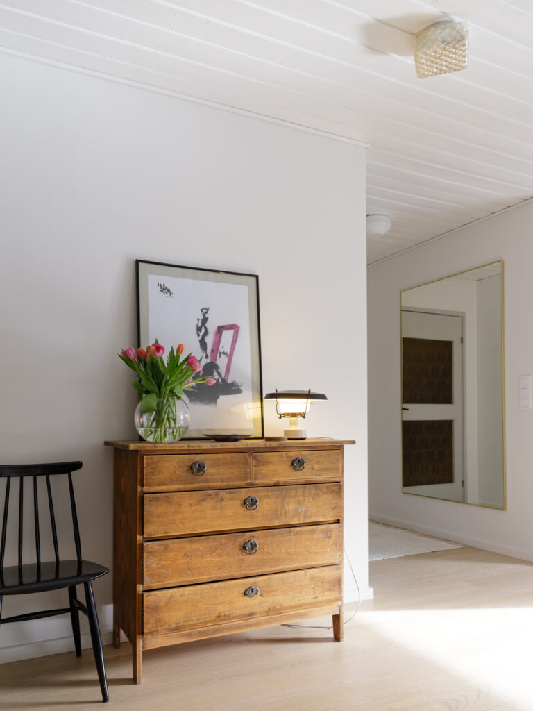 Kohteessa haluttiin kunnioittaa talon 80-luvun henkeä, joten sävy- ja materiaalivalintoja tehtiin tämän ajatuksen pohjalta. Sisustussuunnittelu sisälsi koko talon pintamateriaalivalinnat sekä wc- ja pesutilojen muutossuunnitelmat. Asukkaiden persoonalliset perintökalusteet tekevät tästä kohteesta ihanan kodikkaan ja yllätyksellisen.