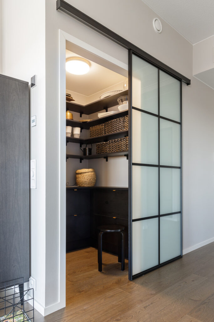 Tampereen keskustassa sijaitseva kattohuoneisto remontoitiin kauttaaltaan uusien asukkaiden toiveiden mukaan. Kokonaisvaltainen kodin sisustussuunnitelma sisälsi pintamateriaalien, kiintokalusteiden, valaistuksen, irtokalusteiden ja tekstiilien suunnittelun. Suunnittelu ulottui myös suuren lasitetun parvekkeen sisustukseen. Suurin tilallinen muutos tehtiin kahden makuuhuoneen yhdistyessä yhdeksi, jolloin toisesta sisäänkäynnistä saatiin lohkaistua tila ruokakomerolle keittiön yhteyteen.
